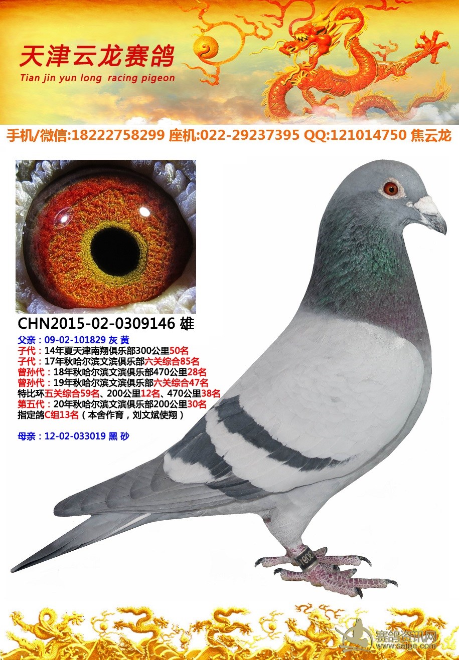 鸽子名称: 足环:2015-02-0309146 性别:♂雄鸽 眼别: 羽色: 年代: 血统: 作育者: