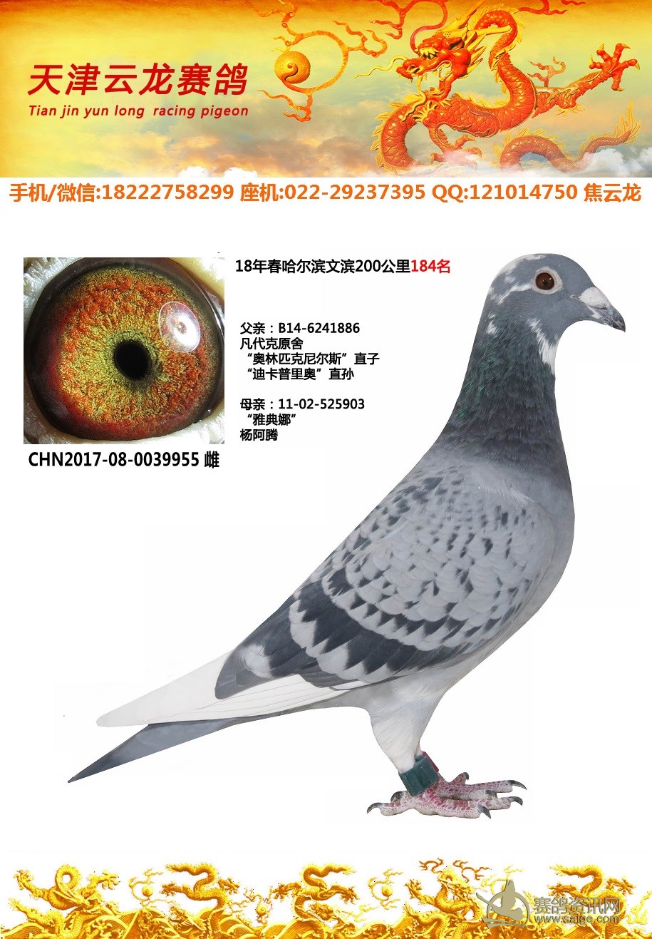 鸽子名称: 足环:2017-08-0039955 性别:♀雌鸽 眼别: 羽色: 年代:2017 血统: 作育者:焦云龙