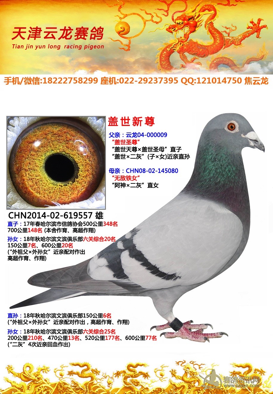 鸽子名称: 足环: 性别:♂雄鸽 眼别: 羽色: 年代:2014 血统: 作育者:焦云龙