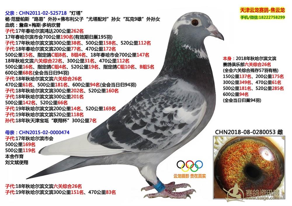 鸽子名称: 足环:2018-08-0280053 性别:♀雌鸽 眼别:黄 羽色:斑白羽 年代:2018 血统:詹森 作育者:焦云龙