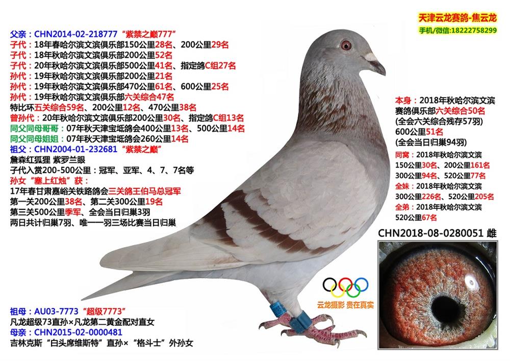 鸽子名称: 足环:2018-08-0280051 性别:♀雌鸽 眼别:砂眼 羽色:红轮 年代:2018 血统:詹森×吉林克斯 作育者:焦云龙