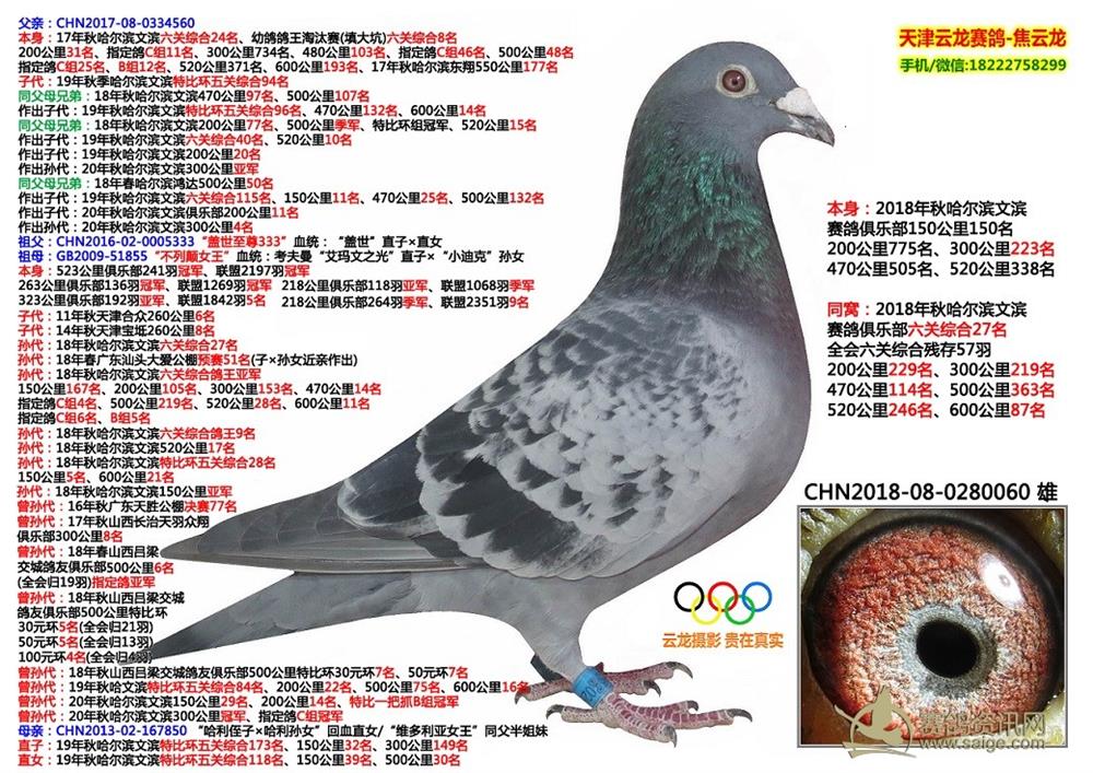 鸽子名称: 足环:2018-08-0280060 性别:♂雄鸽 眼别:砂 羽色:斑 年代:2018 血统:盖世×考夫曼 作育者:焦云龙