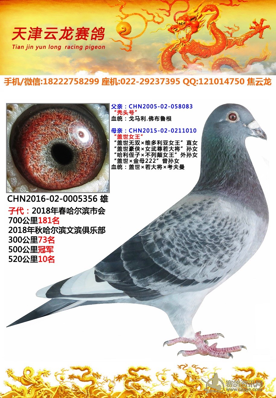 鸽子名称: 足环:2016-02-0005456 性别:♂雄鸽 眼别:砂眼 羽色:喷点白条 年代:2016 血统:戈马利×盖世 作育者:焦云龙