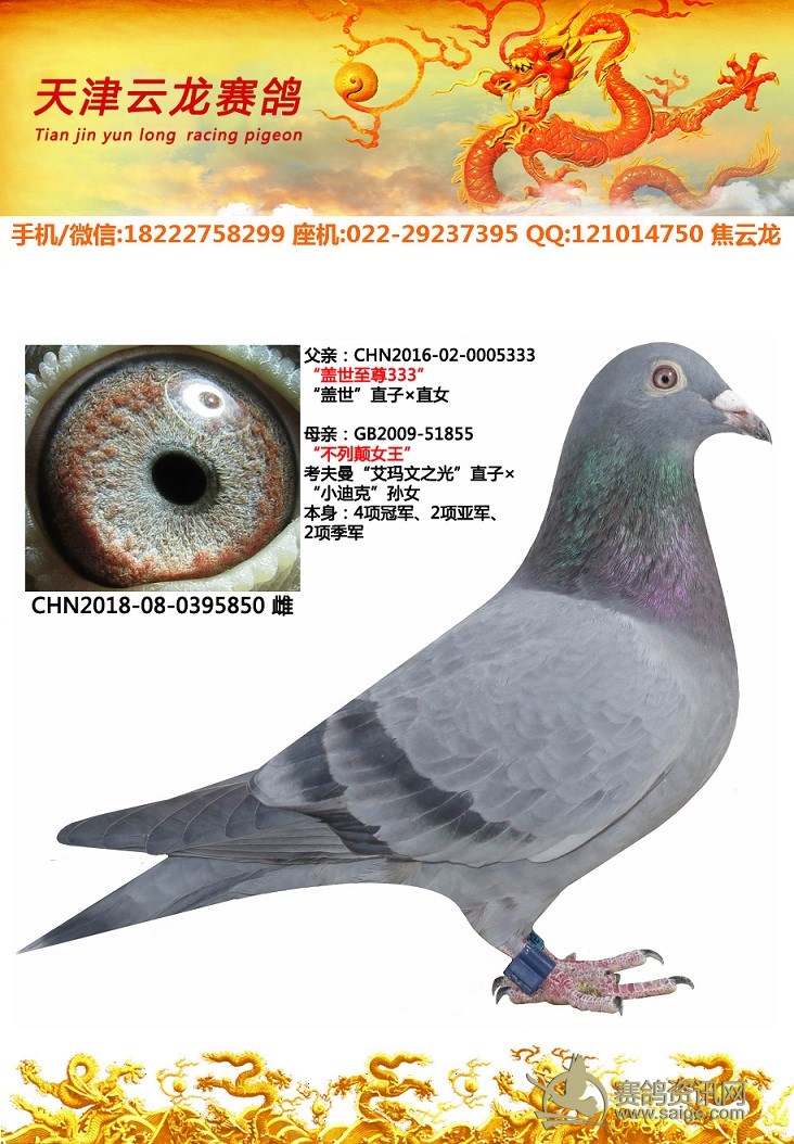 鸽子名称: 足环:2018-08-0395850 性别:♀雌鸽 眼别:砂眼 羽色:石板 年代:2018 血统:盖世×考夫曼 作育者:焦云龙