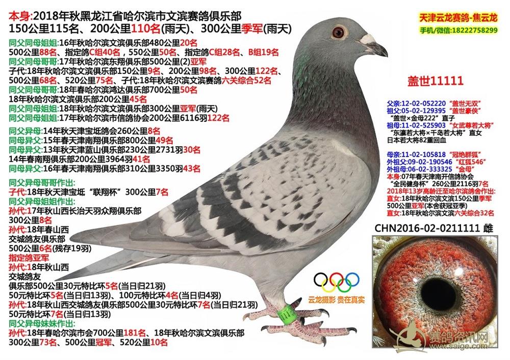 鸽子名称: 足环:CHN2016-02-0211111 性别:♀雌鸽 眼别:砂 羽色:斑 年代:2017 血统:盖世 作育者:焦云龙