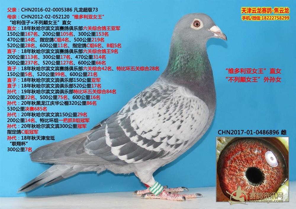 鸽子名称: 足环:2017-01-0486896 性别:♀雌鸽 眼别:砂 羽色:浅斑 年代:2017 血统:考夫曼 作育者:焦云龙