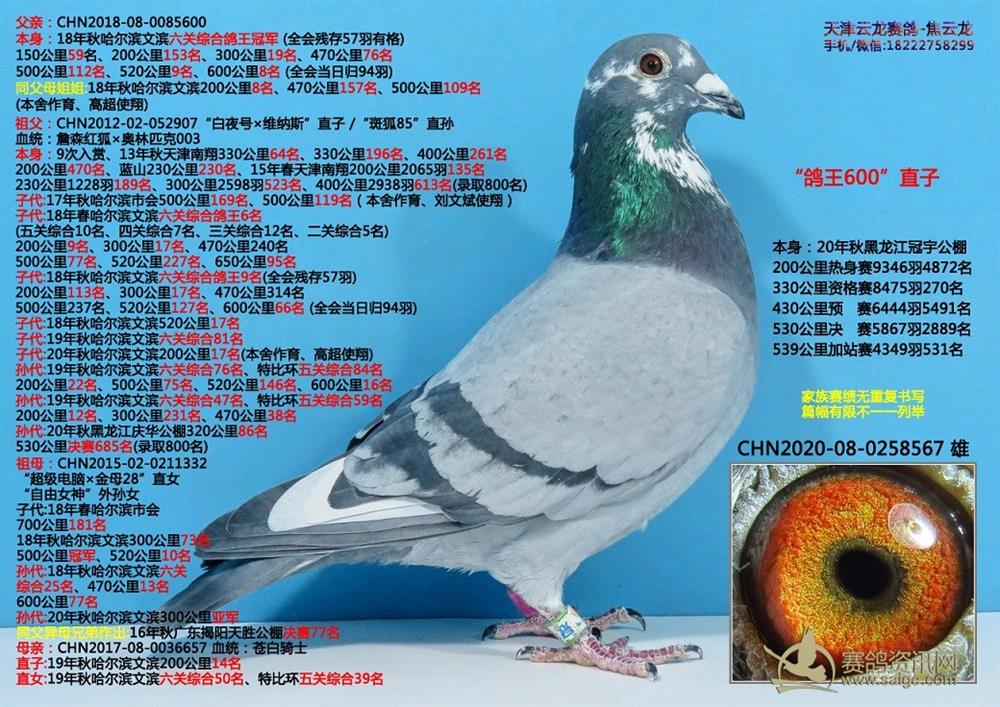 鸽子名称: 足环:2020-08-0258567 性别:♂雄鸽 眼别: 羽色: 年代:2020 血统: 作育者:焦云龙