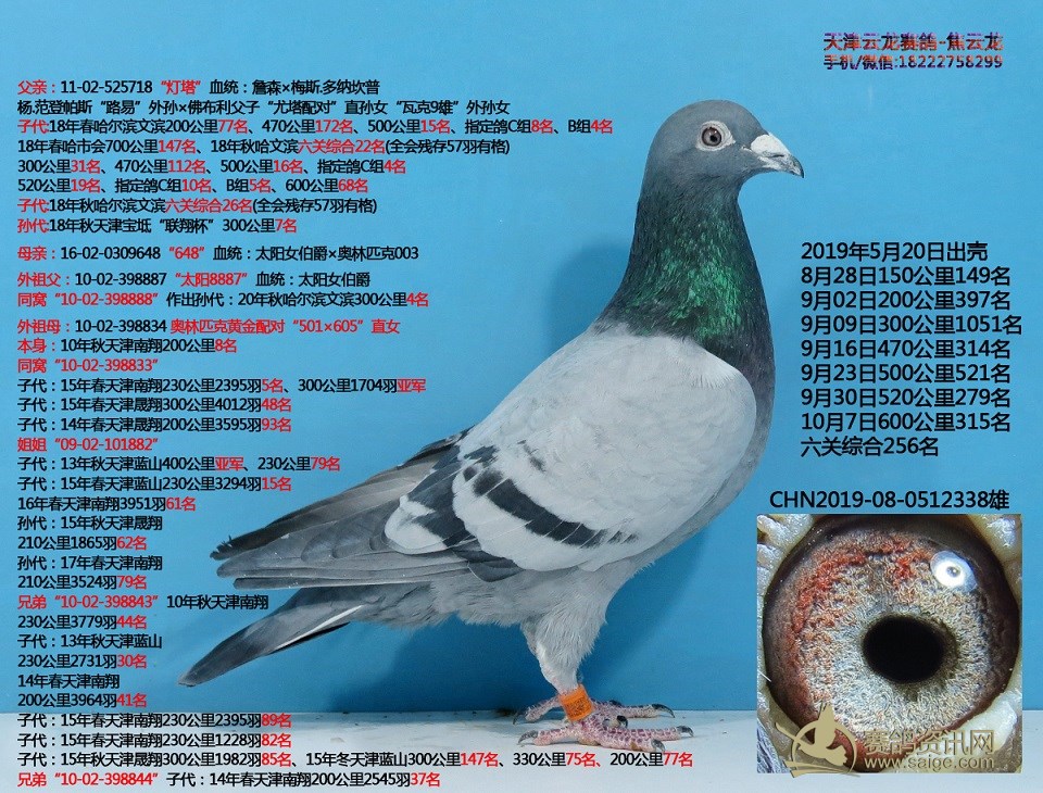 鸽子名称: 足环: 性别:♂雄鸽 眼别: 羽色: 年代:2019 血统: 作育者:焦云龙