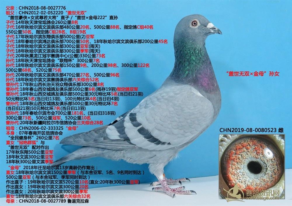 鸽子名称: 足环:2019-08-0080523 性别:♀雌鸽 眼别:砂 羽色:灰 年代:2019 血统:盖世 作育者:焦云龙