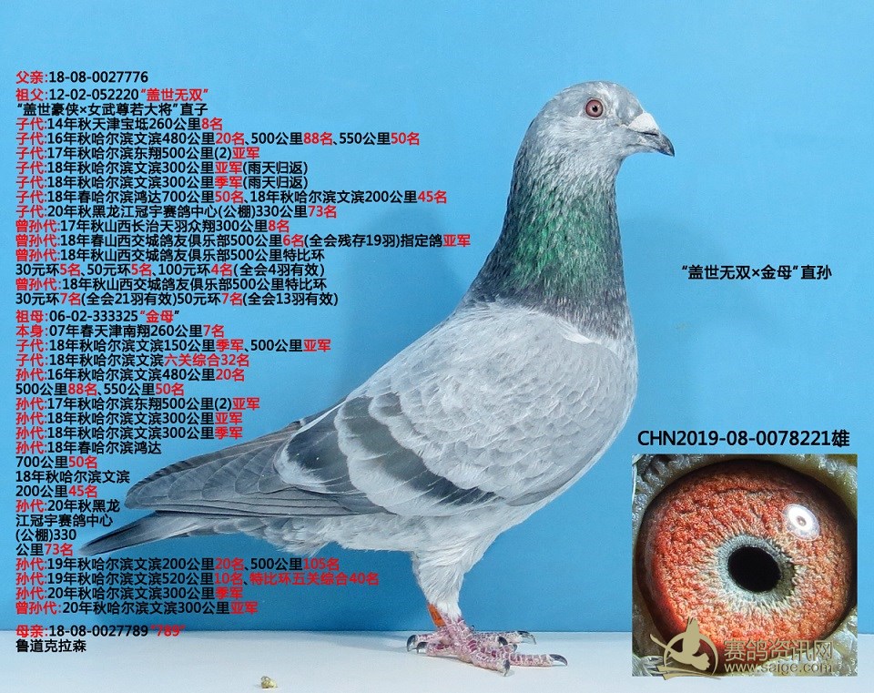 鸽子名称: 足环: 性别:♂雄鸽 眼别: 羽色: 年代:2019 血统: 作育者:焦云龙