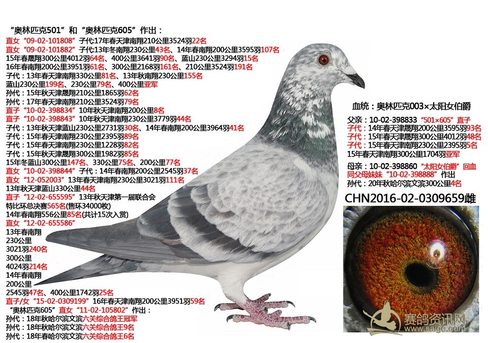 鸽子名称: 足环: 性别:♀雌鸽 眼别: 羽色: 年代: 血统: 作育者: