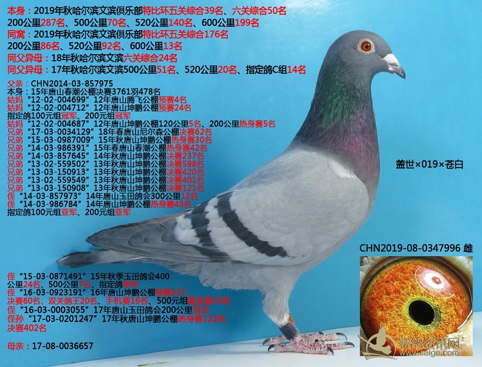 鸽子名称: 足环:2019-08-0347996 性别:♀雌鸽 眼别:黄 羽色:灰 年代:2019 血统:詹森×苍白 作育者:焦云龙