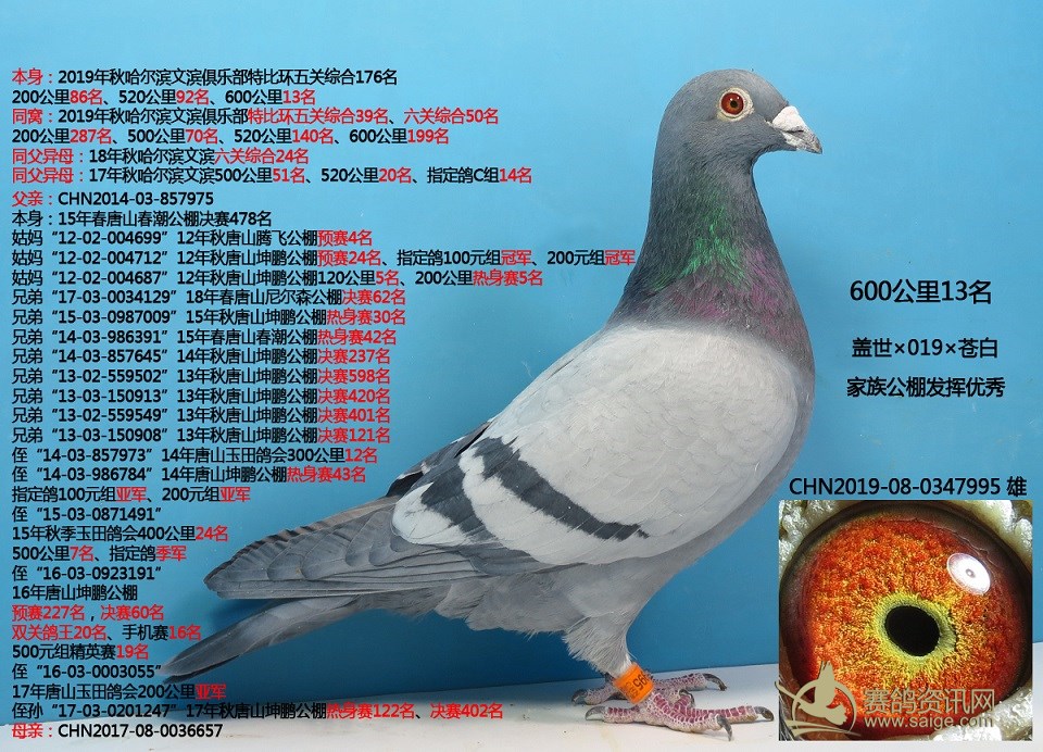 鸽子名称: 足环:2019-08-0347995 性别:♂雄鸽 眼别:黄 羽色:灰 年代:2019 血统: 作育者:焦云龙