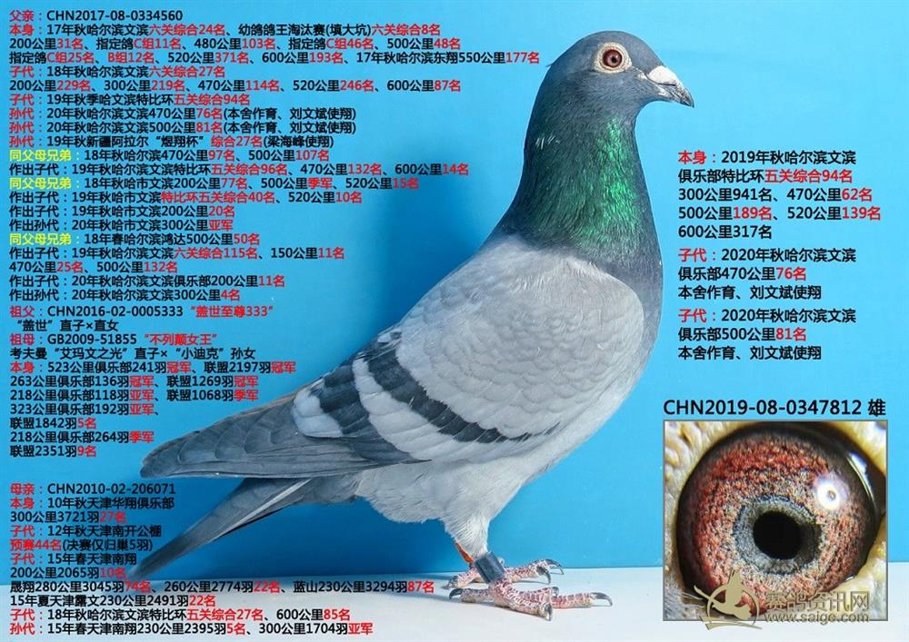 鸽子名称: 足环:2019-08-0347812 性别:♂雄鸽 眼别:砂 羽色:灰 年代:2019 血统:盖世 作育者:焦云龙