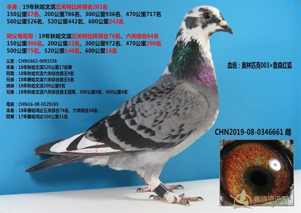 鸽子名称: 足环: 性别:♀雌鸽 眼别: 羽色: 年代:2019 血统: 作育者:焦云龙