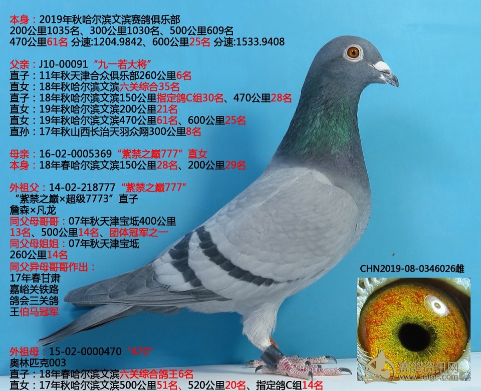 鸽子名称: 足环: 性别:♀雌鸽 眼别: 羽色: 年代:2019 血统: 作育者:焦云龙