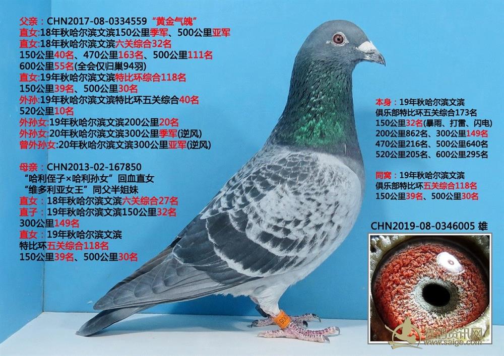 鸽子名称: 足环:2019-08-0346005 性别:♂雄鸽 眼别:砂 羽色:斑 年代:2019 血统:气魄号×哈利 作育者:焦云龙