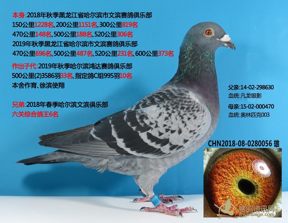 鸽子名称: 足环: 性别:♂雄鸽 眼别: 羽色: 年代:2018 血统: 作育者:焦云龙