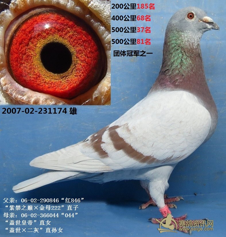鸽子名称: 足环:07-02-231174 性别:♂雄鸽 眼别:黄眼 羽色:红轮 年代:2007 血统:詹森×盖世×二灰 作育者:焦云龙