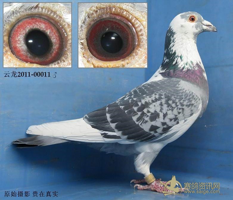 鸽子名称: 足环:云龙赛鸽2011-00011 性别:♂雄鸽 眼别:牛眼 羽色:雨点白条 年代:2011 血统:杨阿腾×詹森 作育者:焦云龙