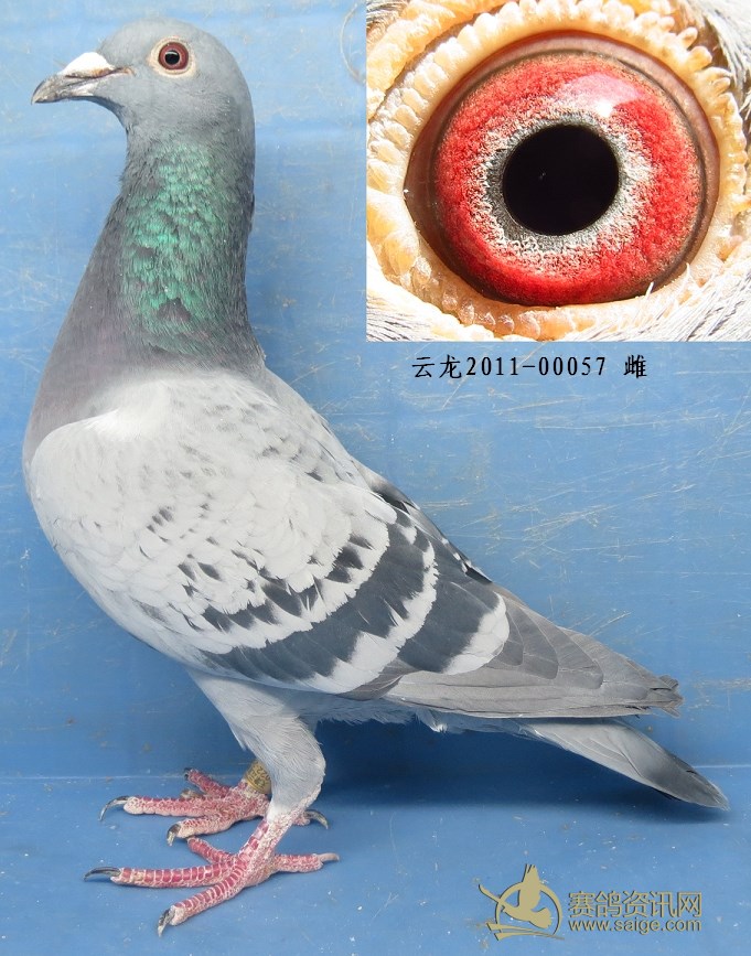 鸽子名称: 足环:云龙赛鸽2011-00057 性别:♀雌鸽 眼别:砂眼 羽色:浅斑 年代:2011 血统:考夫曼 作育者:焦云龙
