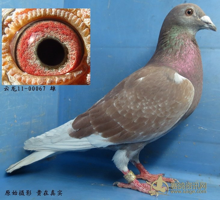 鸽子名称: 足环:云龙赛鸽2011-00067 性别:♀雌鸽 眼别:砂眼 羽色:红 年代:2011 血统:紫禁之巅 作育者:焦云龙