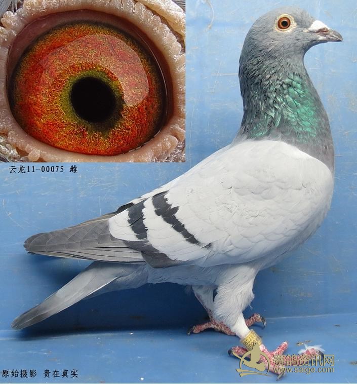 鸽子名称: 足环:云龙赛鸽2011-00075 性别:♀雌鸽 眼别:黄 羽色:灰 年代:2011 血统: 作育者:焦云龙