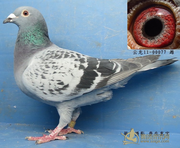 鸽子名称: 足环:云龙赛鸽2011-00077 性别:♀雌鸽 眼别:砂眼 羽色:浅斑 年代:2011 血统:阿神 作育者:焦云龙