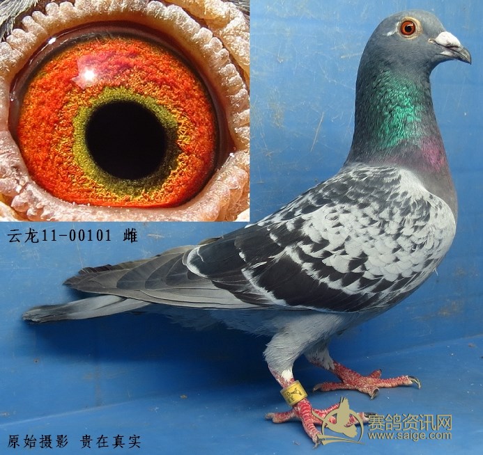 鸽子名称: 足环:云龙赛鸽2011-00101 性别:♂雄鸽 眼别:黄 羽色:雨点 年代:2011 血统: 作育者:焦云龙