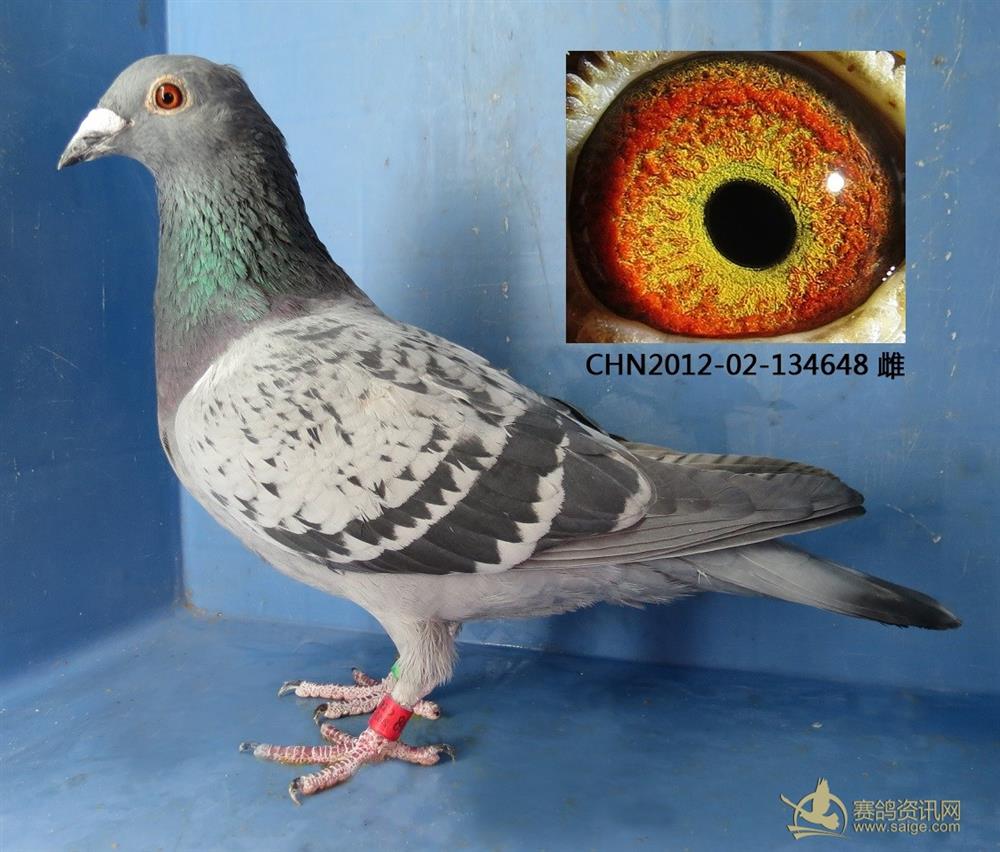 鸽子名称: 足环:12-02-134648 性别:♀雌鸽 眼别:黄眼 羽色:浅斑 年代:2012 血统:詹森 作育者:焦云龙