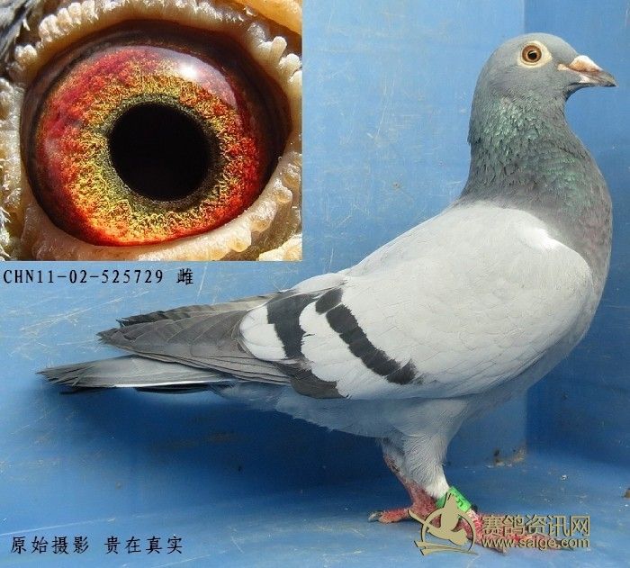 鸽子名称: 足环:11-525729 性别:♀雌鸽 眼别:黄 羽色:灰 年代:2011 血统:盖世 作育者:焦云龙