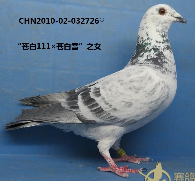 鸽子名称: 足环:10-02-032726 性别:♀雌鸽 眼别: 羽色:麒麟花 年代:2010 血统:苍白骑士 作育者:焦云龙