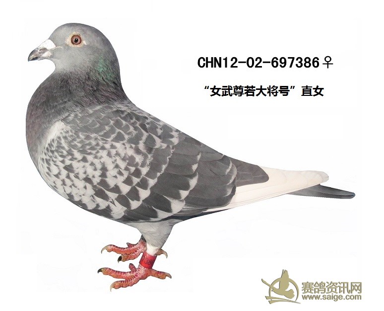 鸽子名称: 足环:12-02-697386 性别:♀雌鸽 眼别:砂眼 羽色:斑白羽 年代:2012 血统:若大将 作育者:焦云龙