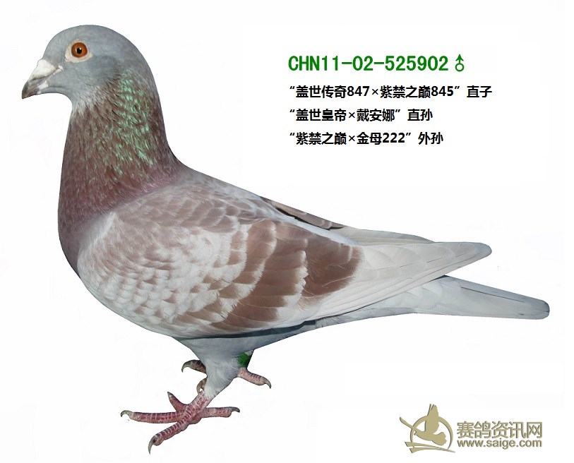 鸽子名称: 足环:11-02-525902 性别:♂雄鸽 眼别:黄眼 羽色:红斑 年代: 血统:盖世×紫禁之巅 作育者:
