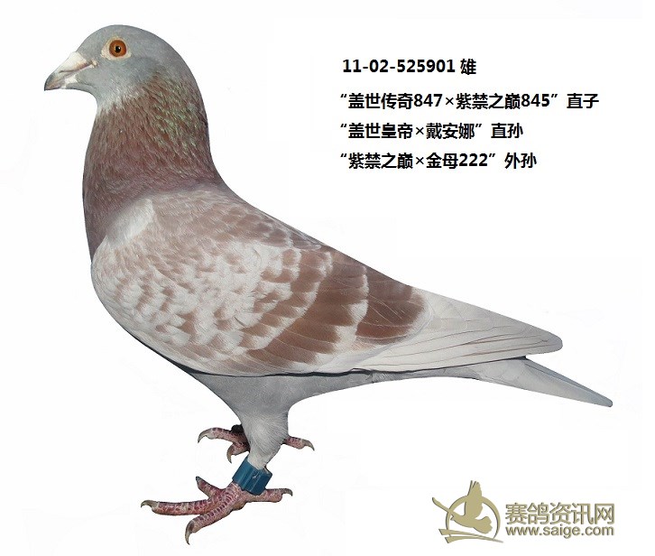鸽子名称: 足环:11-02-525901 性别:♂雄鸽 眼别:黄眼 羽色:红斑 年代:2011 血统:盖世×紫禁之巅 作育者:焦云龙
