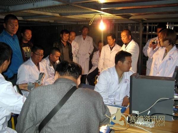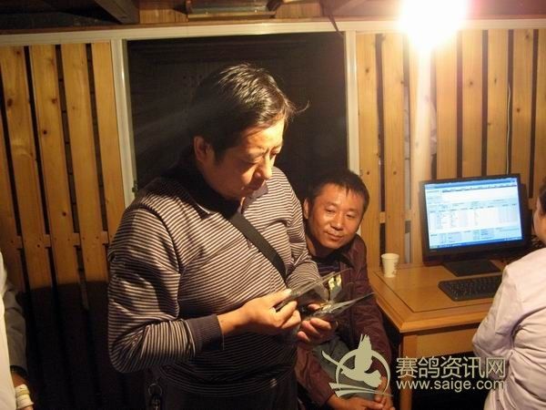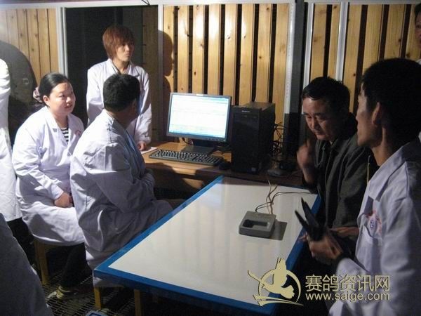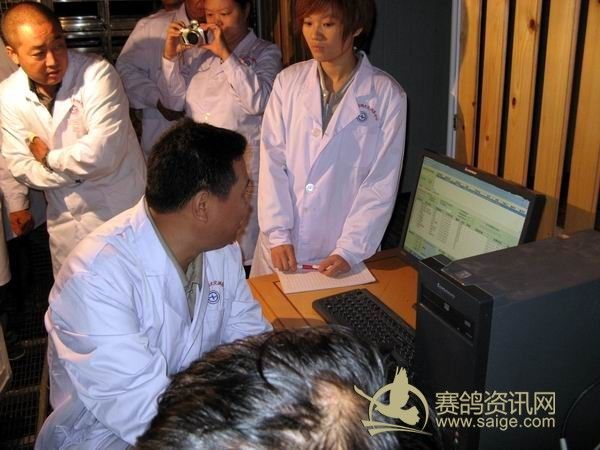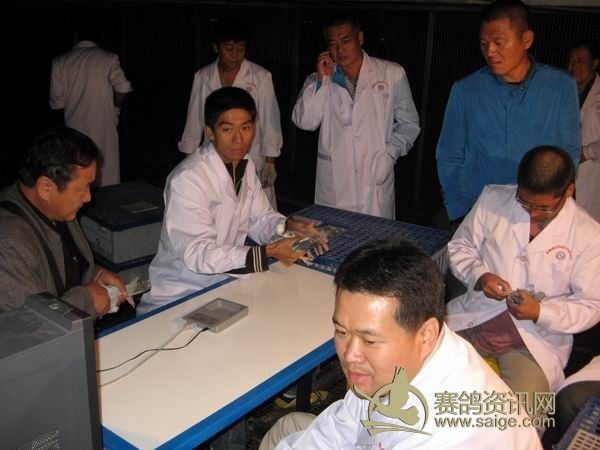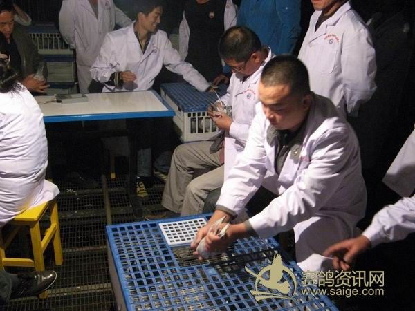 新疆雅旺信鸽文化驯养中心——清棚现场,裁判按清棚程序读环号,比对计算机内的数据