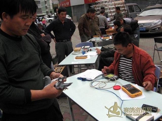 乌鲁木齐市水麽沟区信鸽协会2012年秋季300公里大奖赛集鸽现场——裁判贾士平.核对足环数据