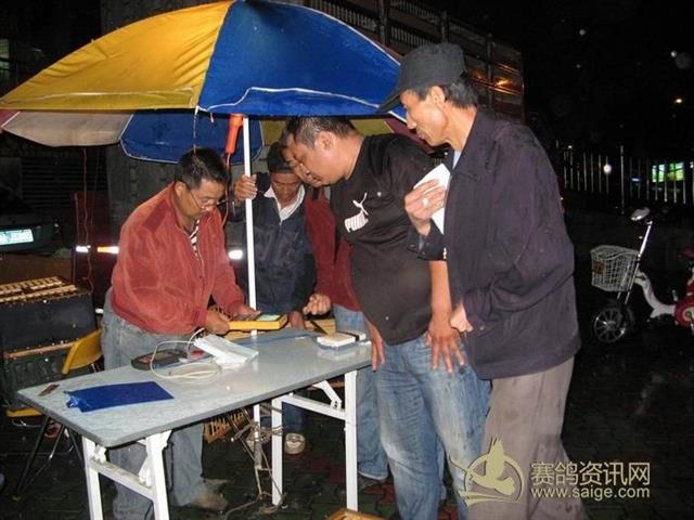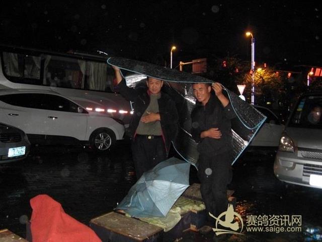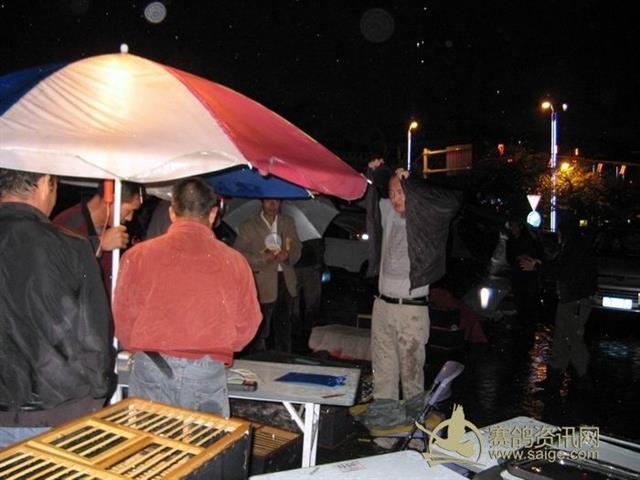 此时,已经陆陆续续来了很多鸽友,裁判们在冒着雨集鸽,会员们也在雨中等待爱鸽上笼,北京时间23:32时集鸽结束。