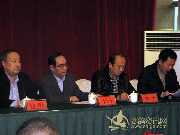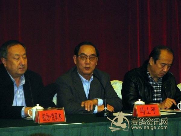 新疆2013年信鸽协会干部培训班开班典礼,新疆体育局副局长祖龙*克里木(图左一)、新疆信鸽协会主席马士平讲话(图左二)、乌鲁木齐市体育局副局长兼乌鲁木齐市信鸽协会主席刘中(图左三)