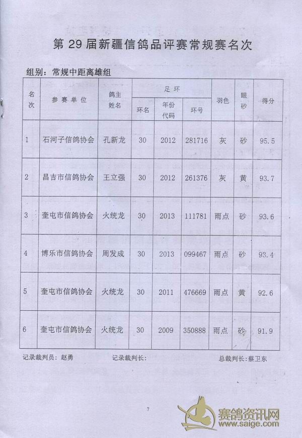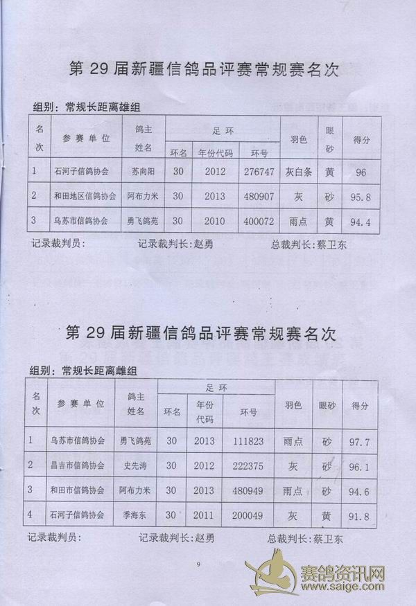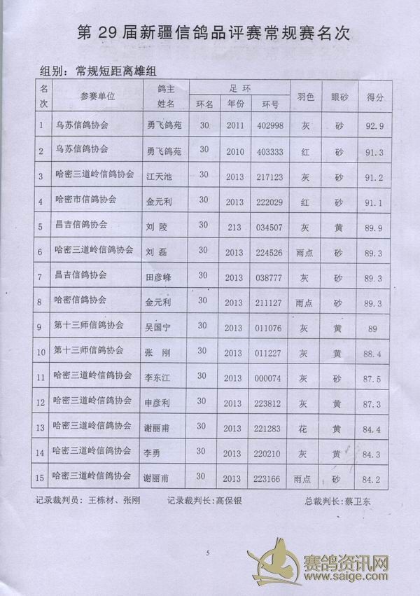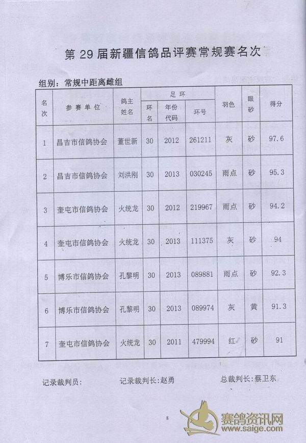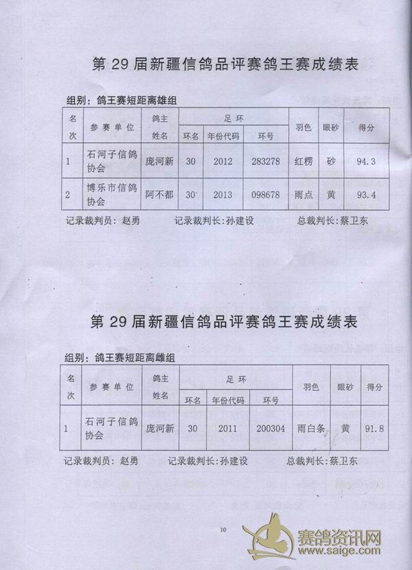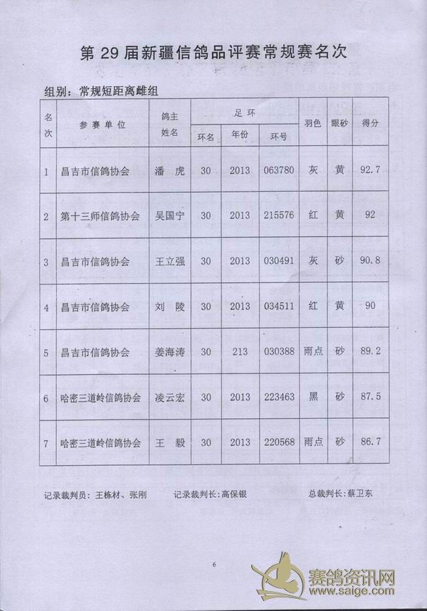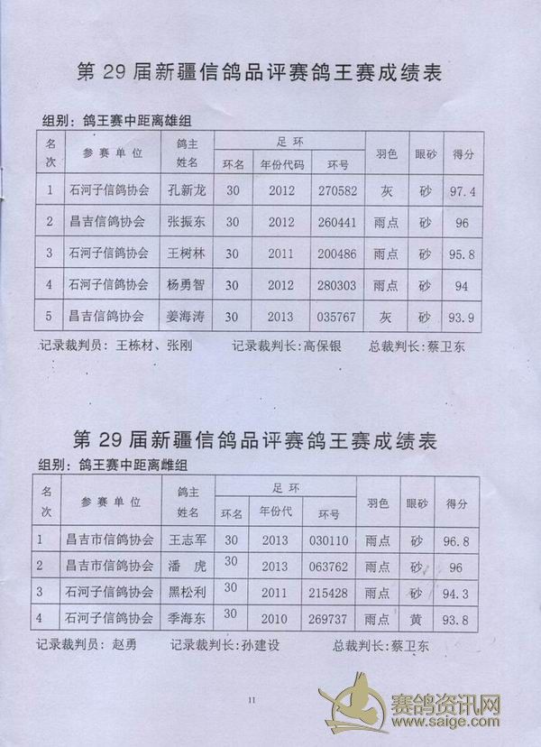 新疆第29届信鸽品评赛获奖成绩单