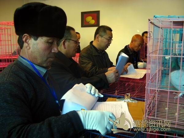 新疆第29届信鸽品评赛现场,裁判在认真给参赛鸽评分