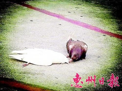 惠州日报记者 张东玲 摄 近日,在惠东九龙峰前,一只白鸽被车子撞死后,它的同伴一只黑色鸽子守在身旁,久久不肯离去。黑鸽时而为白鸽捋捋羽毛,时而亲亲它的小嘴。围观的人越来越多,看到有人试图靠近,黑鸽突然立起身子,尾巴羽毛都竖了起来。