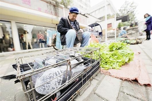 “每次带鸽子出来卖菜,都会遇到这样的买主。”郑仁开笑着说,他在家附近种了1亩多的菜,每隔一两天就会骑自行车到附近菜市场售卖,而每次出门都会带上几只鸽子,“一方面可以向家里人报个平安,另一方面,鸽子也需要不断接受飞行训练。”
