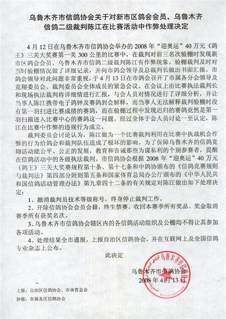 乌鲁木齐市信鸽协会对在比赛中作弊的处理决定