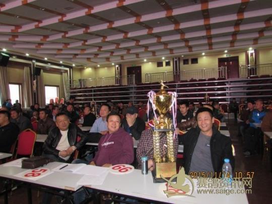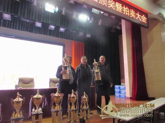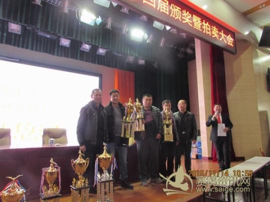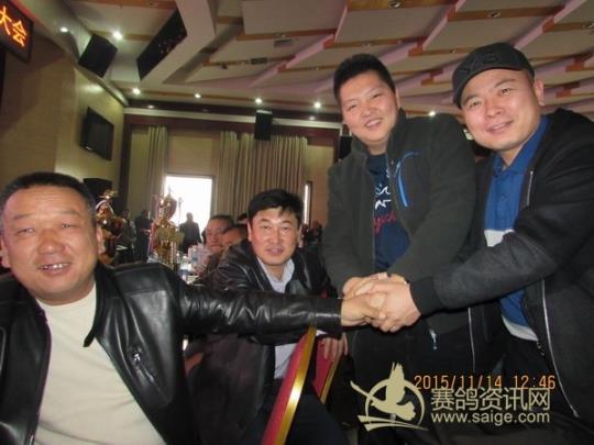 新疆库尔勒铁门关公棚颁奖及拍卖现场,右二好友李明,获得此场比赛鸽王冠军