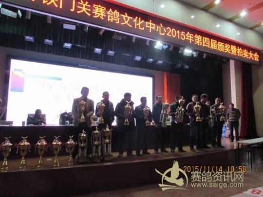 新疆库尔勒铁门关公棚颁奖及拍卖现场,乌鲁木齐市4位好友,相约明年再战“铁门关”,每人50000元/10羽赛鸽。