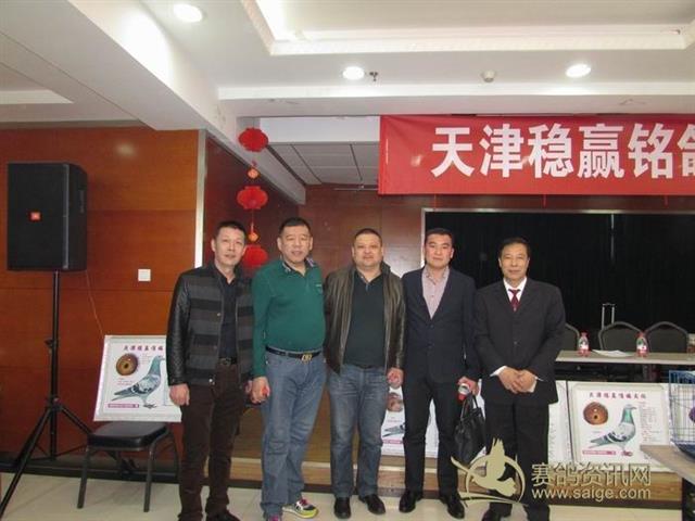 天津稳赢铭鸽、名药首届新疆乌鲁木齐市展卖会现场,图左起,乌苏市信鸽协会赵勇主席、此次展卖会主办方何总、乌苏市鸽友、精河云翔公棚梁云芳总经理、拍卖师肖雄