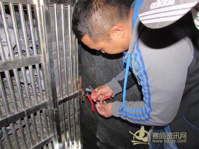 新疆大爱飞天公棚2016年春季200km首关赛集鸽现场,副裁判长给赛鸽车上铅封