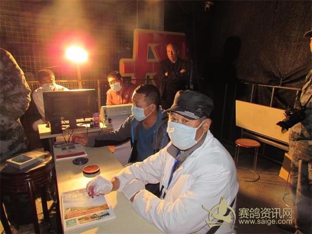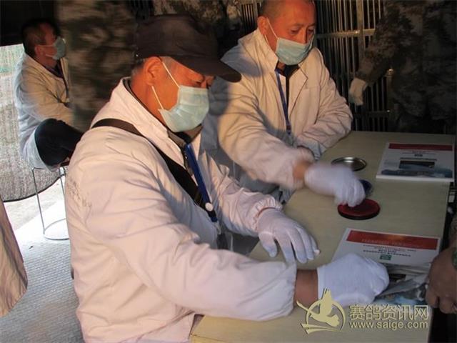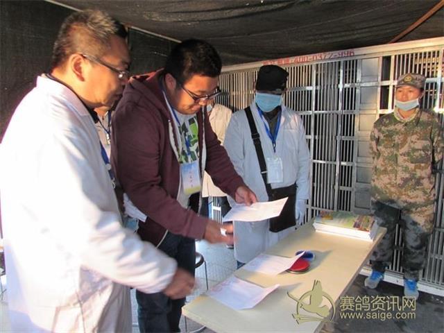 新疆大爱飞天公棚2016年春季200km首关赛集鸽现场。裁判员及鸽友代表查验棚