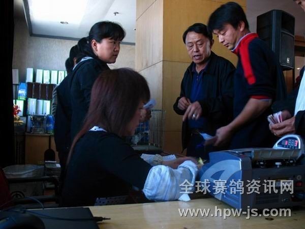 11.拍到赛鸽的鸽友在交款取鸽,新疆赛鸽名家翟正富(图右2)拍回自己的爱鸽